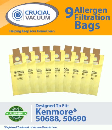 Kenmore 50688, 50690 9-Pack Allergen Filtration Vacuum Cleaner Bags - Fits Kenmore 20-5068, 20-50681, 20-50688, 20-50690, Panasonic U-2, Sanyo PU-1, Kenmore Type O, Kenmore Type U Vacuum Cleaner Bags; Designed & Engineered By Crucial Vacuum Review
